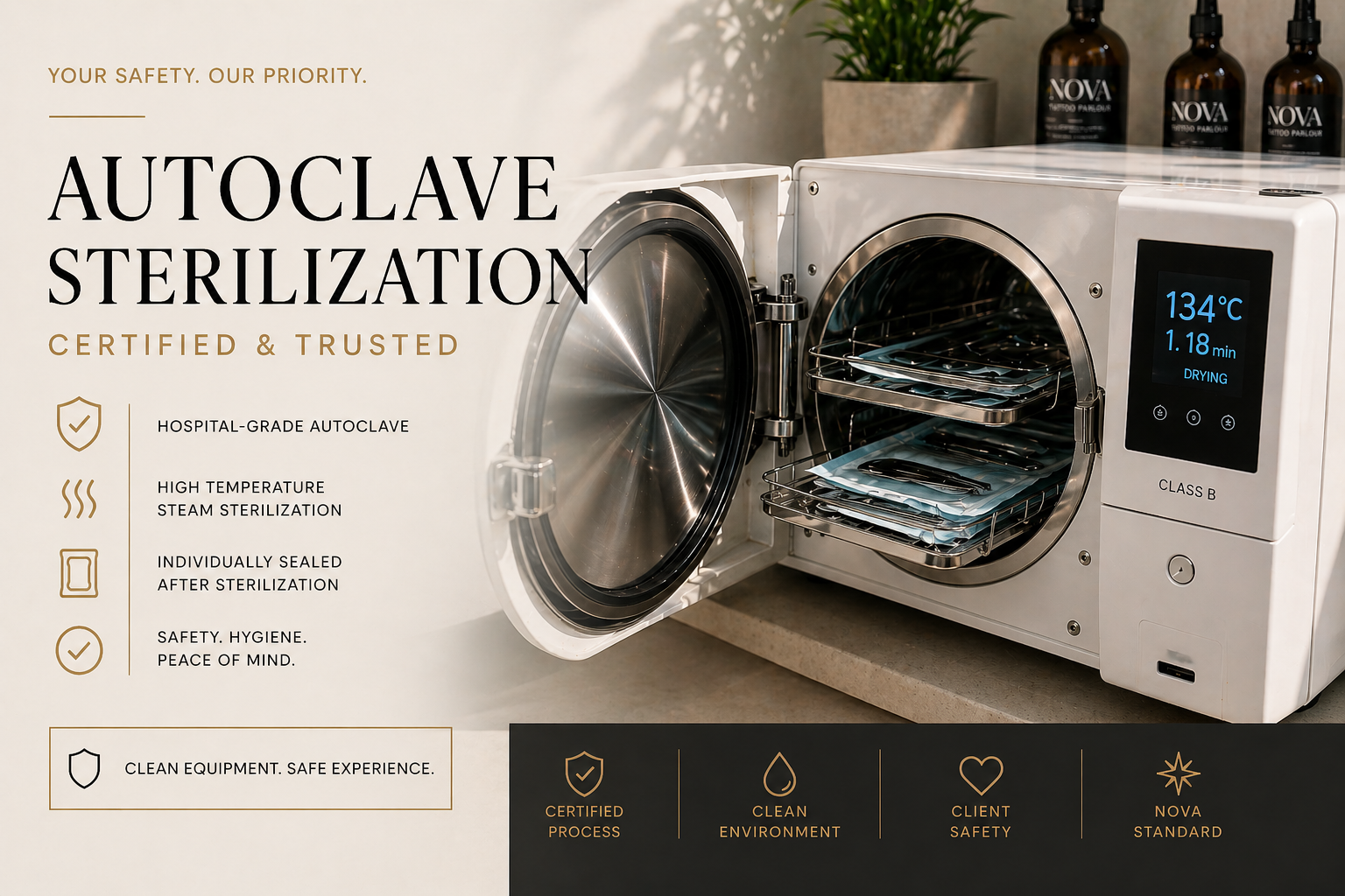 We use hospital-grade autoclave sterilization to ensure every piece of equipment is 100% clean, safe and ready for your session.